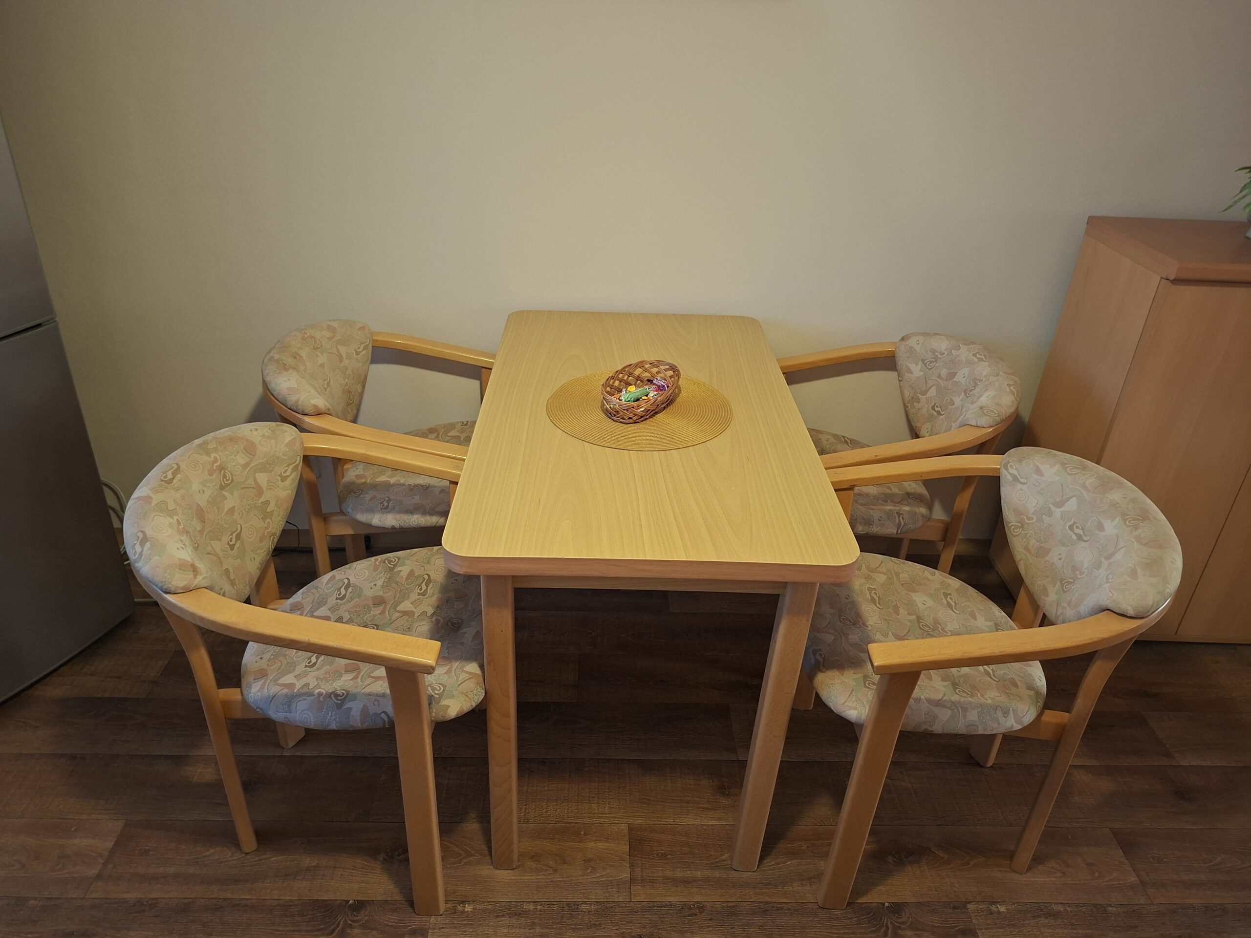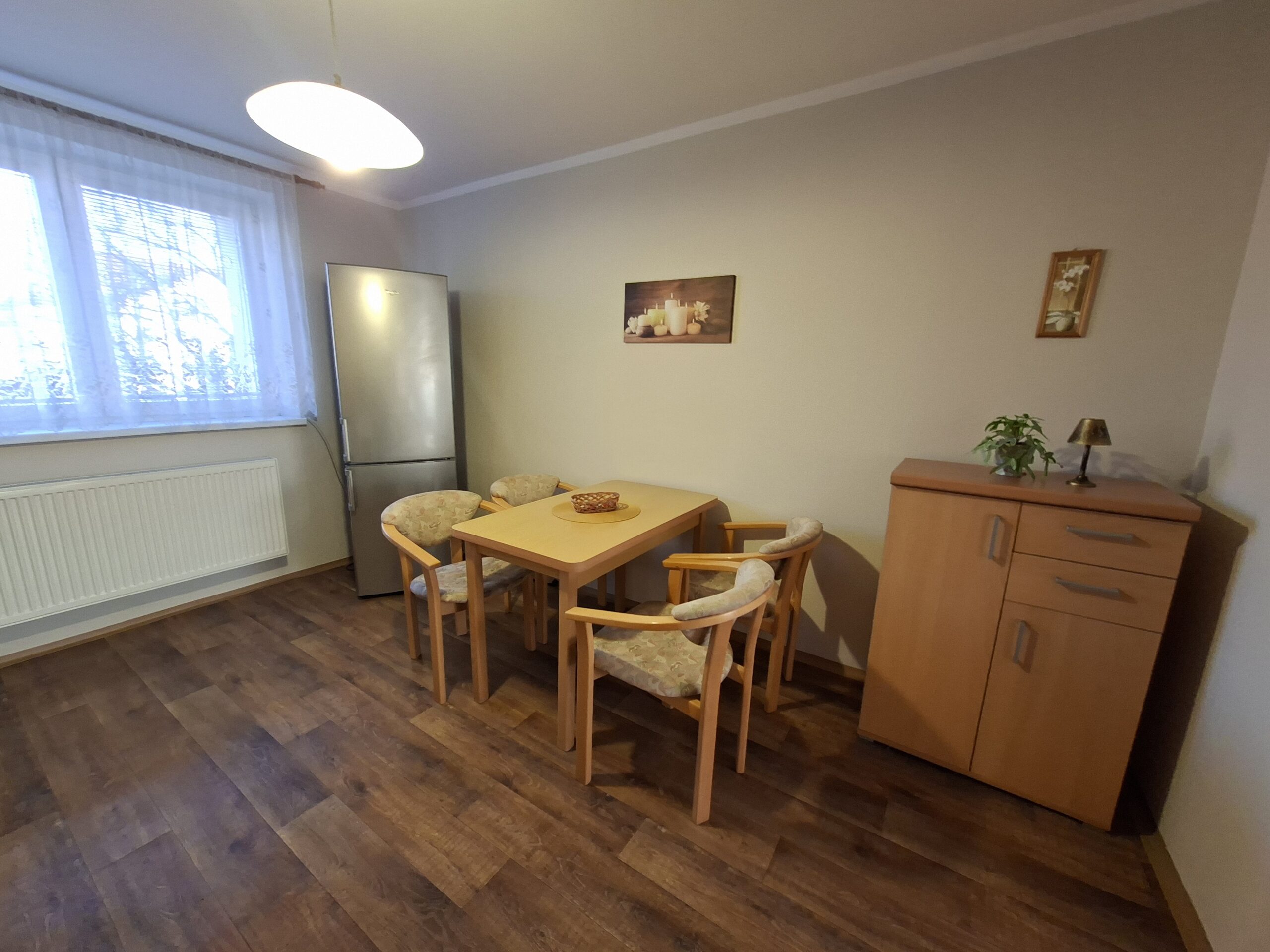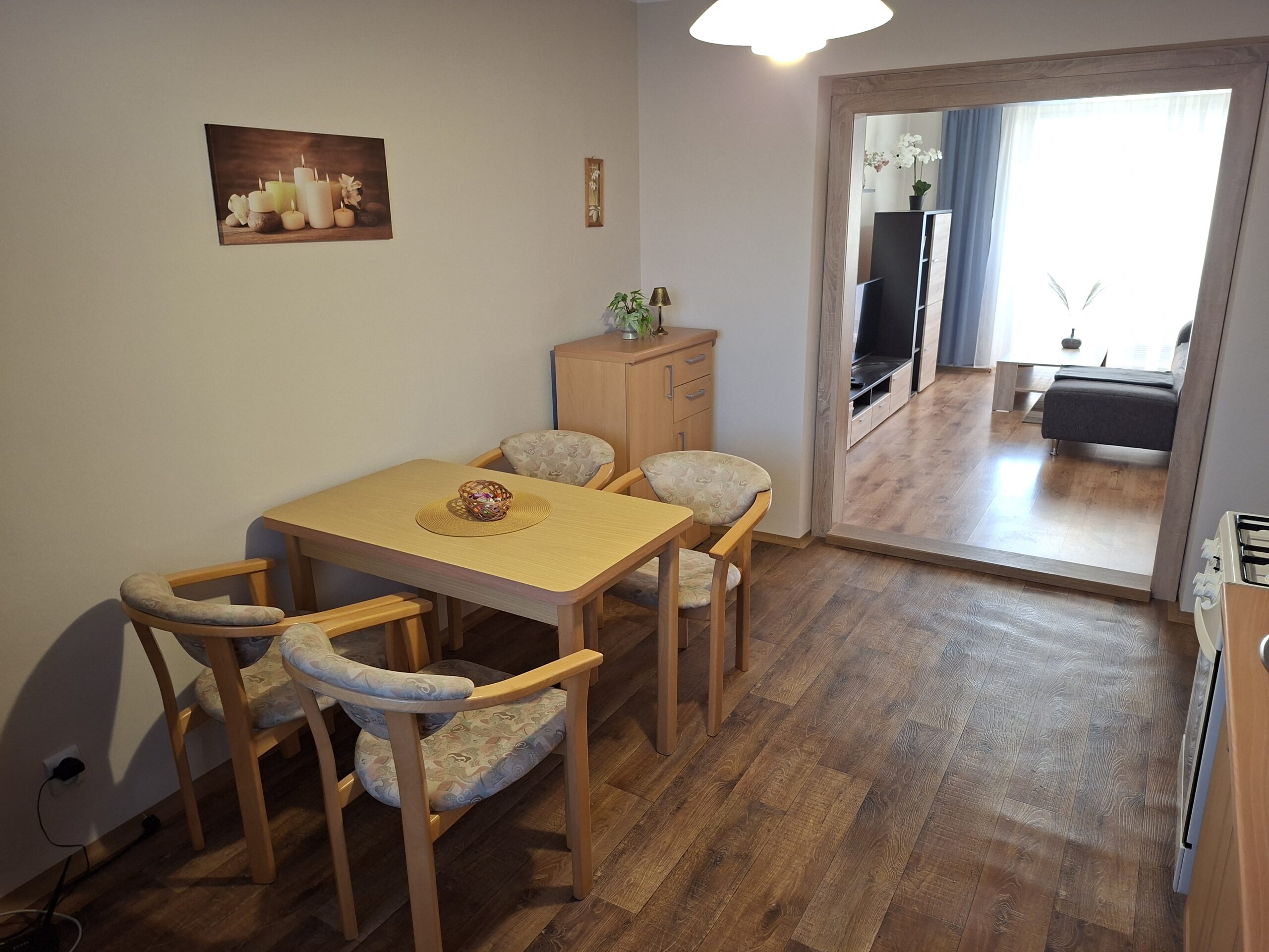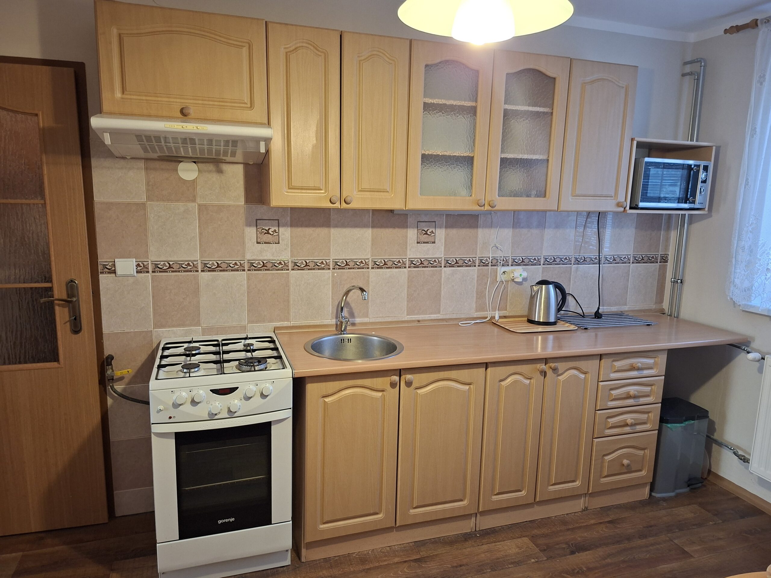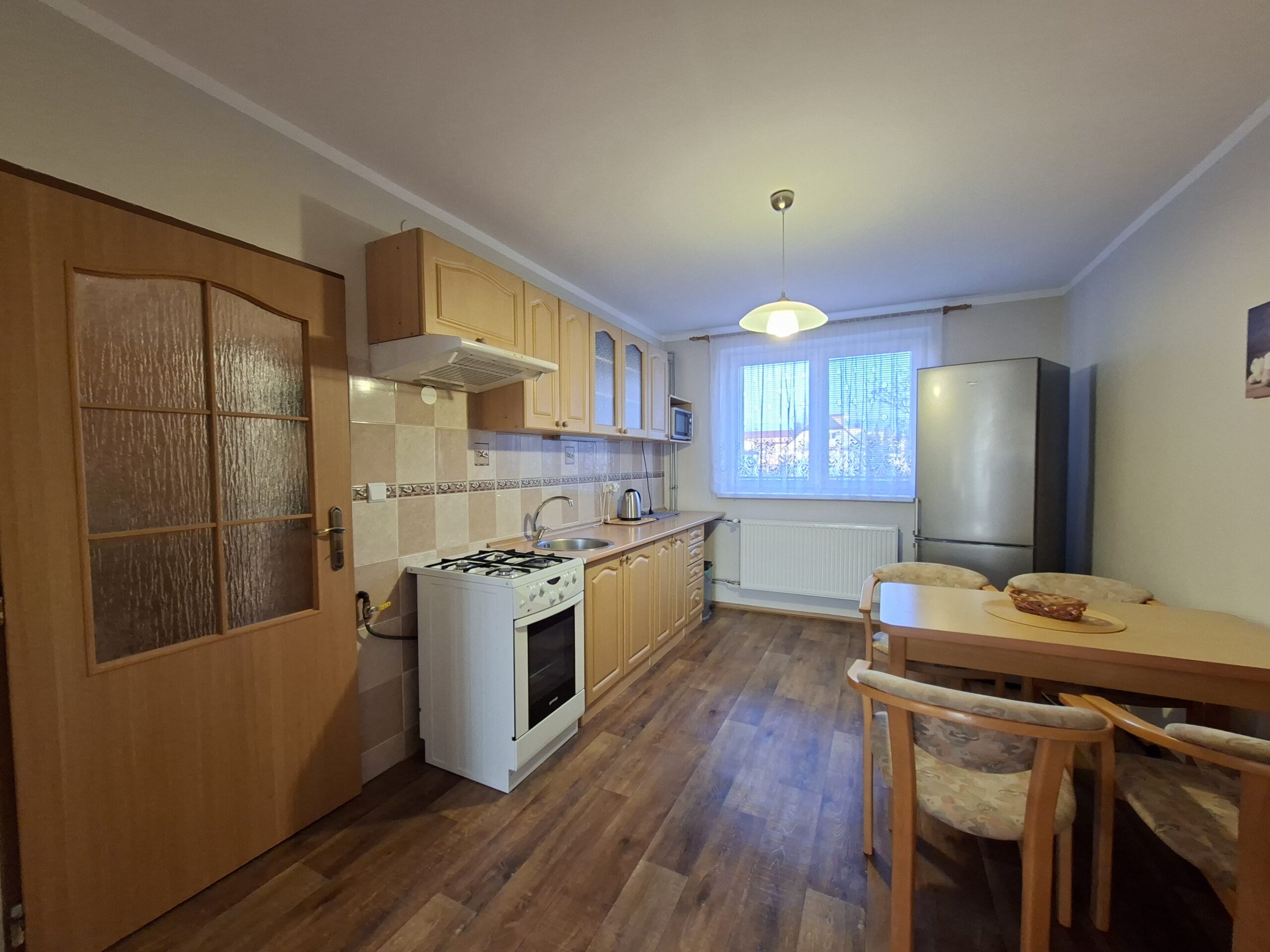kuchyňa-kuchynská linka s kombinovaným sporákom (plyn-elektrika), chladnička, stôl, stoličky