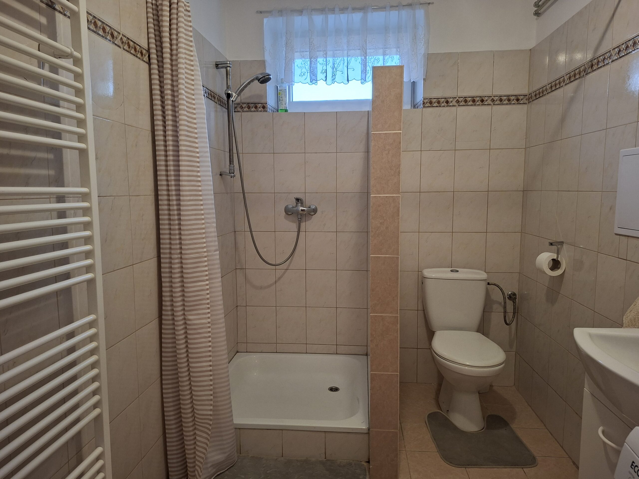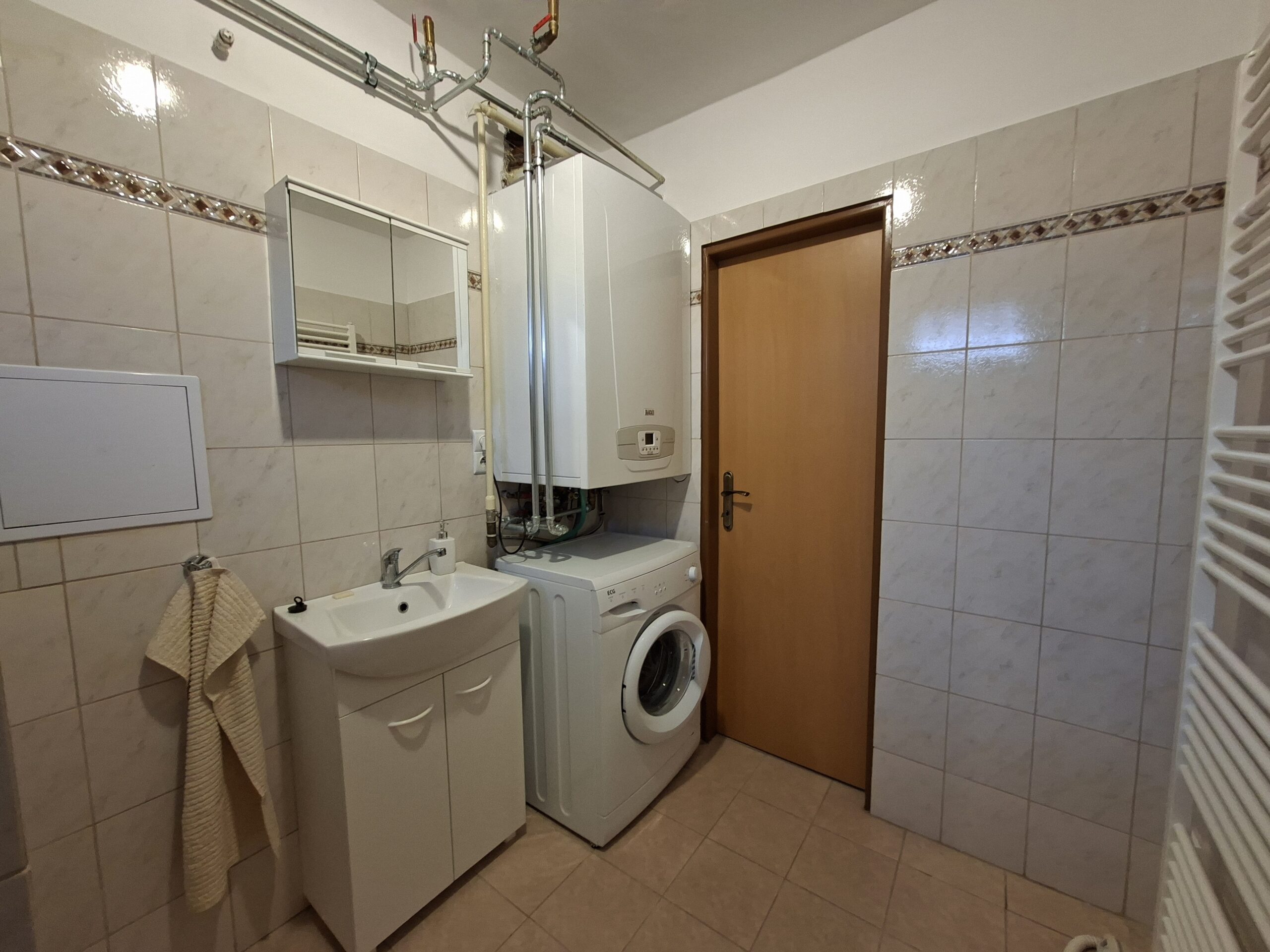 kúpeľňa s toaletou – sprchový kút, skrinka s umývadlom a pračka