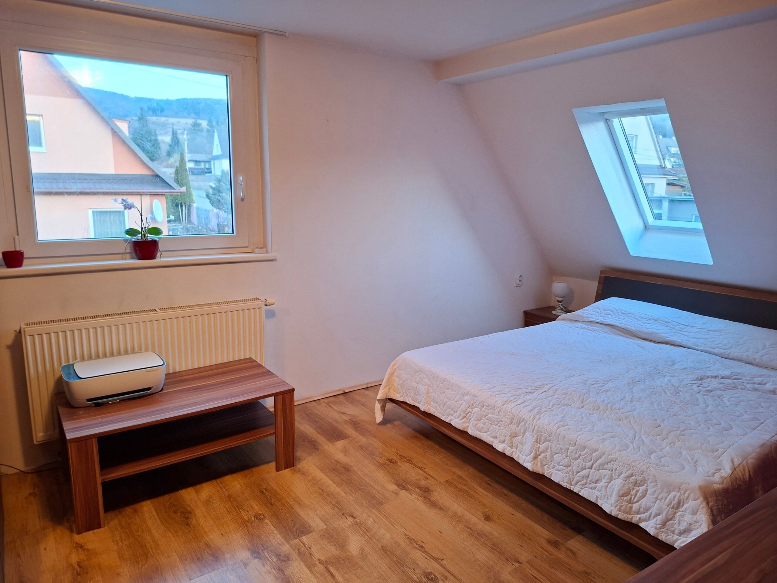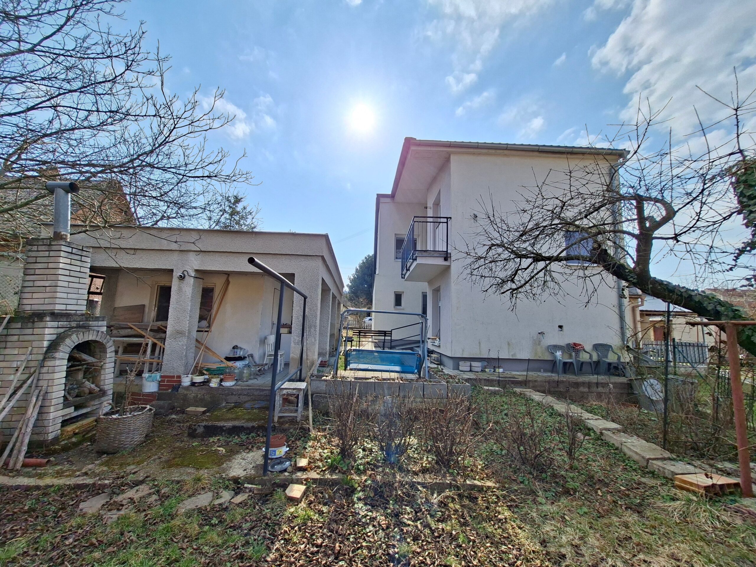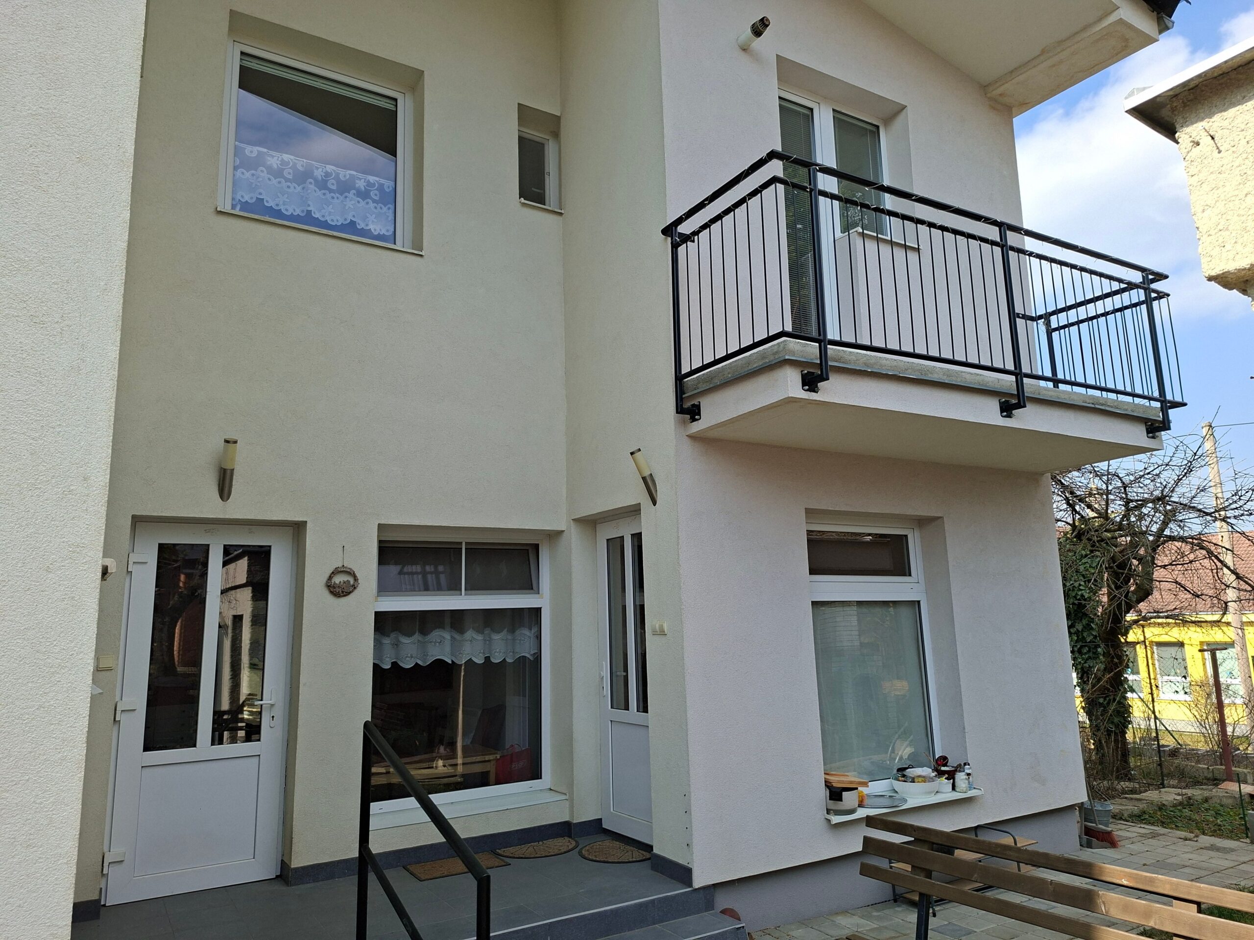 Schodisko vás zavedie na poschodie o výmere 80m2, ktoré môže fungovať ako samostatná bytová jednotka. Nachádza sa tu ďalšia kuchyňa a kúpeľňa s balkónom čo robí z tohto domu ideálne riešenie pre dvojgeneračné bývanie, kde má každý svoje vlastné súkromie. Okrem toho tu nájdete druhú obývačku a dve útulné izby, ktoré môžu slúžiť ako spálne, detské izby alebo tichá pracovňa s výhľadom na okolitú zeleň. Táto časť rodinného domu vznikla nadstavbou na pôvodný dom a skolaudovaná bola v roku 2014. V prípade potreby je možné vytvoriť ďalšiu obytnú miestnosť s plnohodnotným oknom do záhrady.