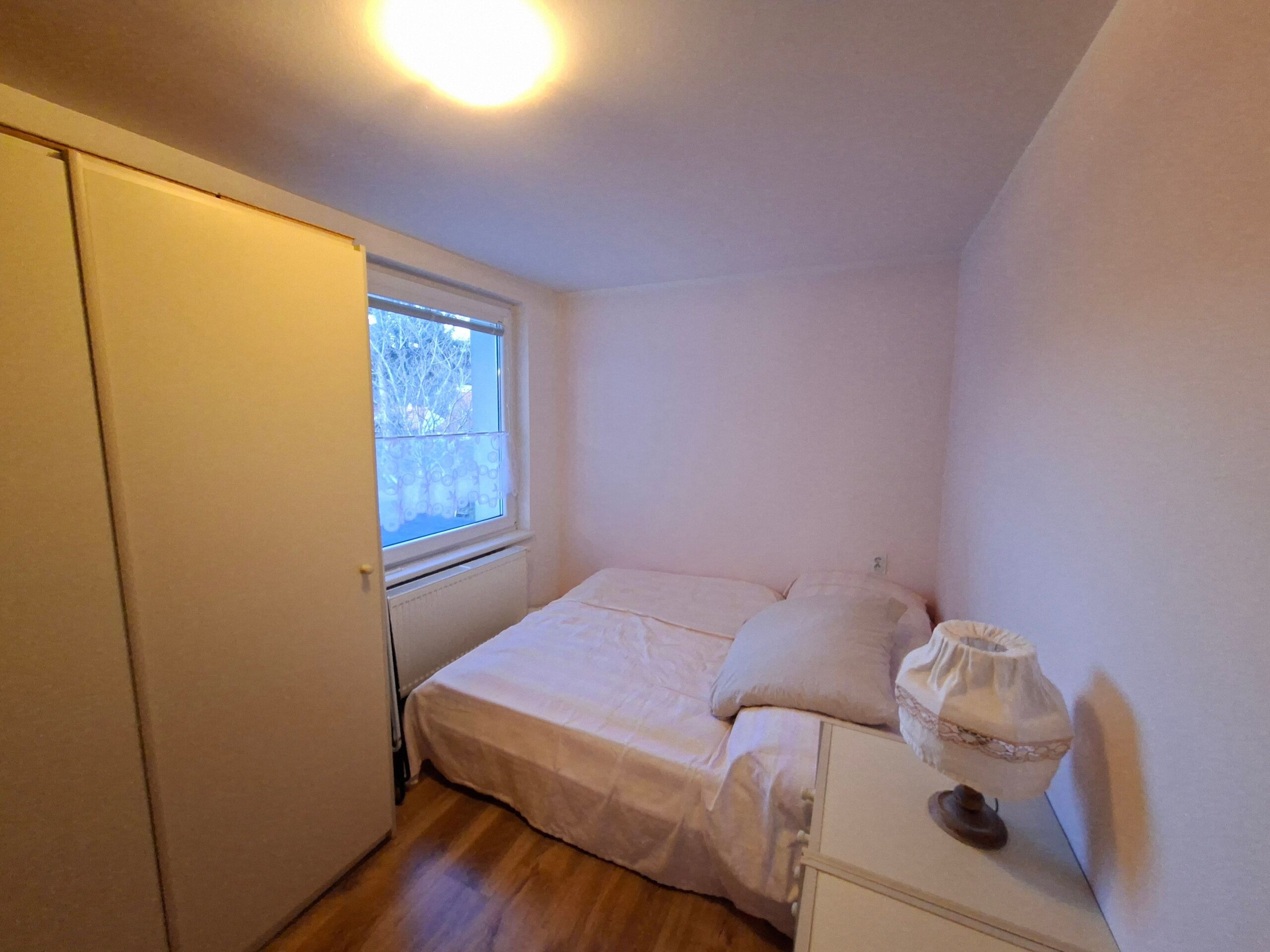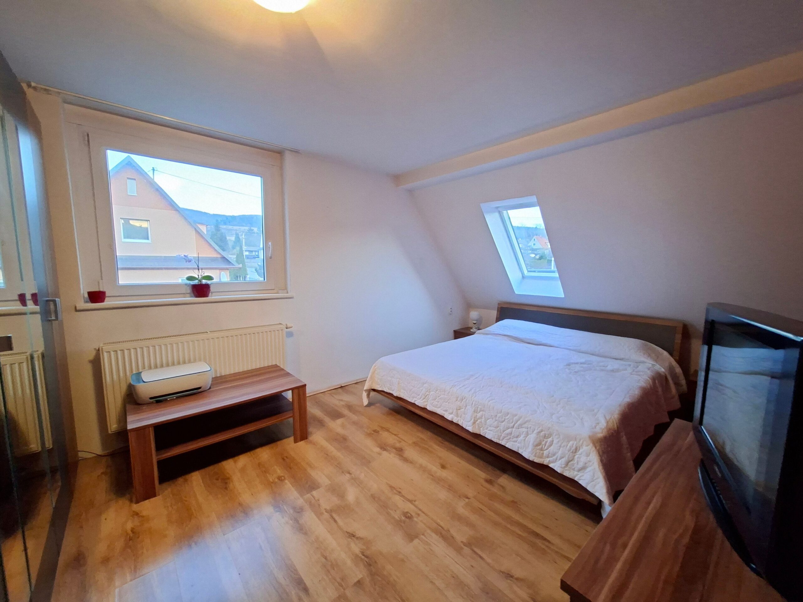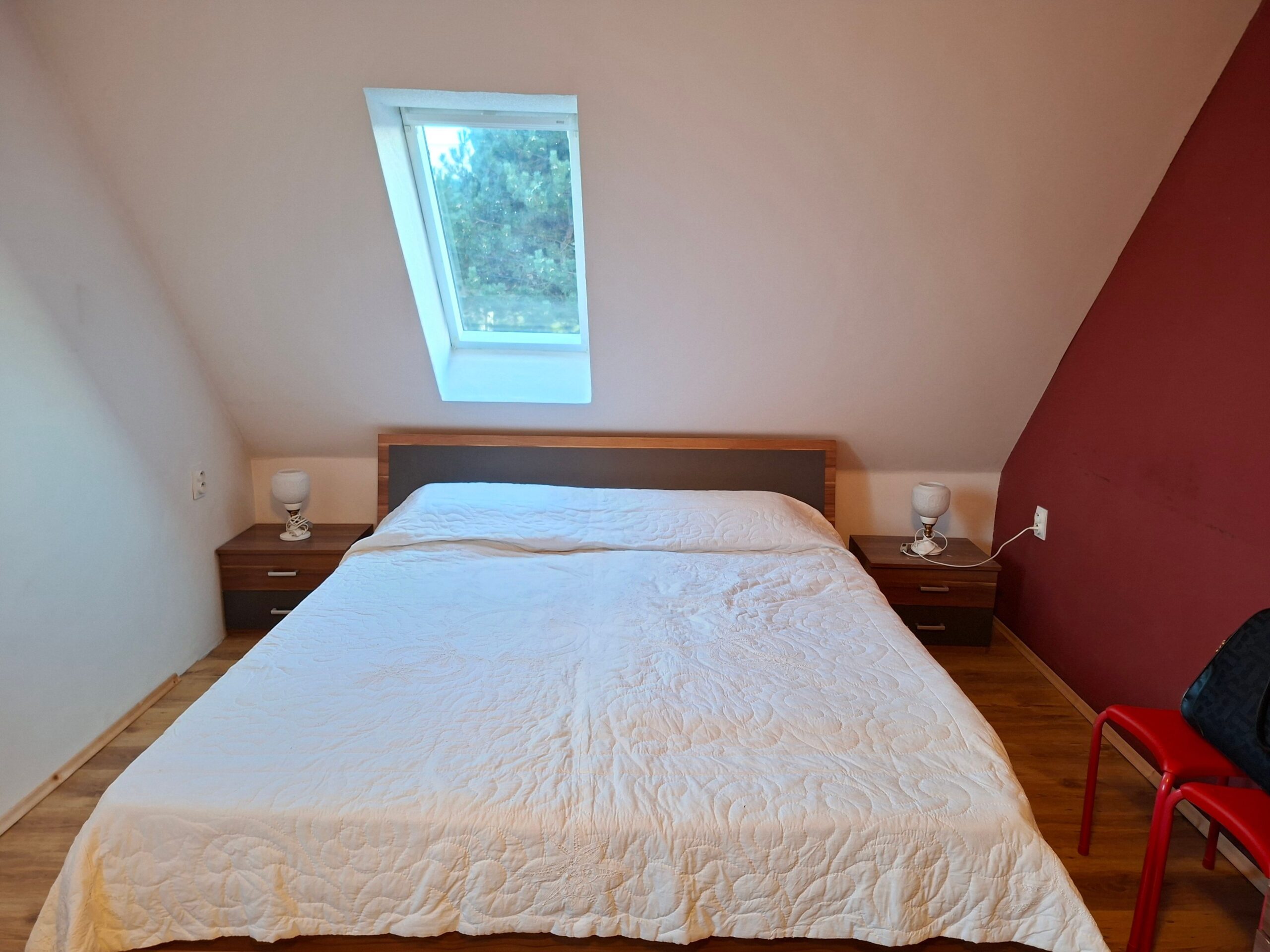 Schodisko vás zavedie na poschodie o výmere 80m2, ktoré môže fungovať ako samostatná bytová jednotka. Nachádza sa tu ďalšia kuchyňa a kúpeľňa s balkónom čo robí z tohto domu ideálne riešenie pre dvojgeneračné bývanie, kde má každý svoje vlastné súkromie. Okrem toho tu nájdete druhú obývačku a dve útulné izby, ktoré môžu slúžiť ako spálne, detské izby alebo tichá pracovňa s výhľadom na okolitú zeleň. Táto časť rodinného domu vznikla nadstavbou na pôvodný dom a skolaudovaná bola v roku 2014. V prípade potreby je možné vytvoriť ďalšiu obytnú miestnosť s plnohodnotným oknom do záhrady.